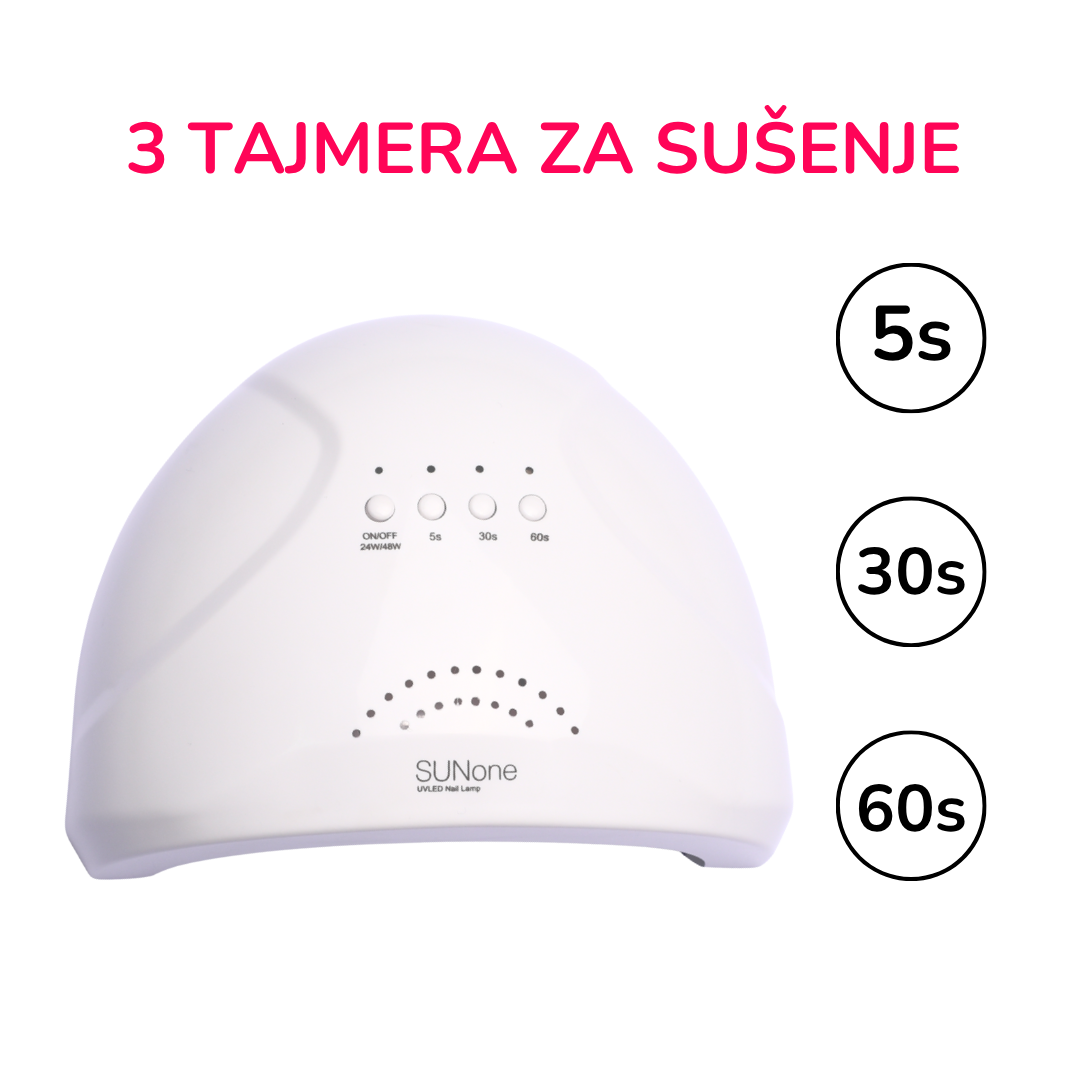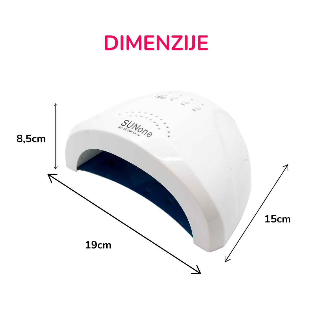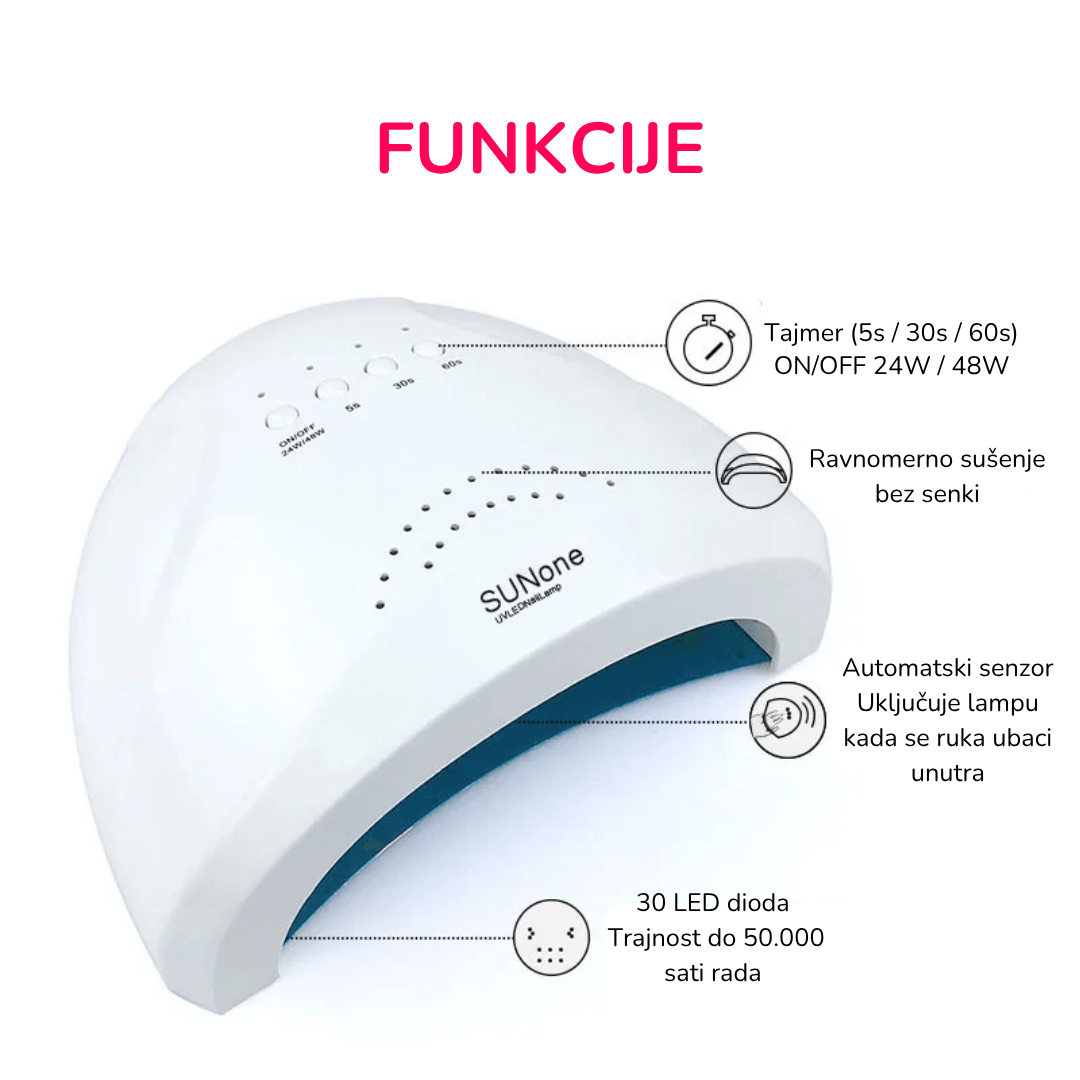Profesionalna lampa Sun One namenjena je za sušenje svih UV i UV/LED preparata namenjenih za manikir i pedikir. Poseduje 30 led diode talasnih duzina 365 I 405 nm. Lampa poseduje izmenljivo dno.
